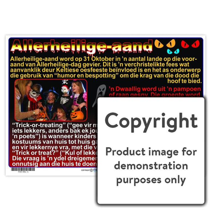 Full colour Afrikaans wall chart / poster depicting Halloween " Allerheilige-aand ". This chart describes what Halloween is and that it is celebrated on the 31st of October. This poster also explains the purpose of pumpkins / turnips with carved faces and trick-or-treating.