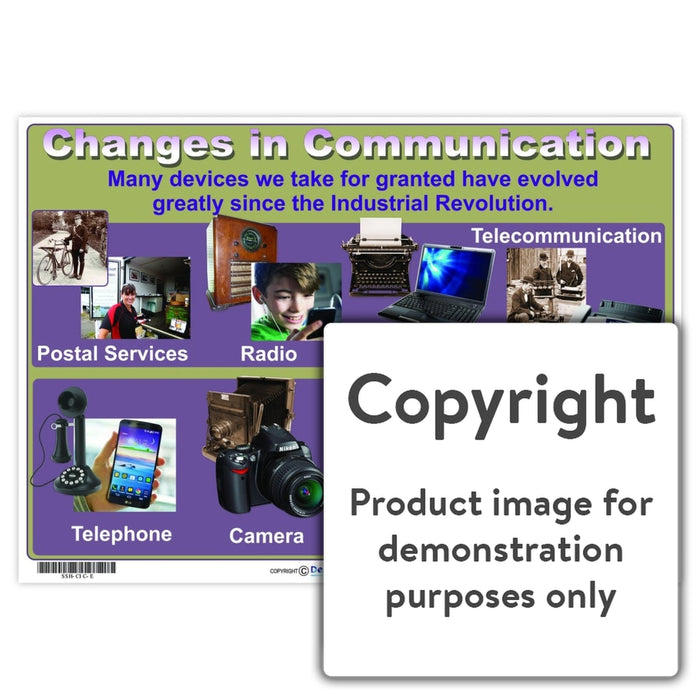 Full colour wall chart / poster depicting how communication has changed over the years. This chart depicts and names seven different types of communication.