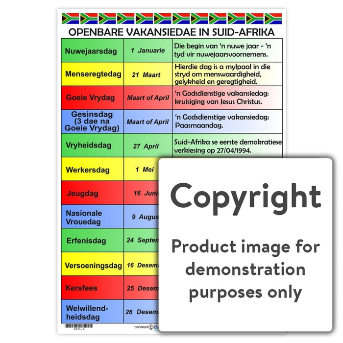 Full colour wall chart / poster depicting the twelve public holidays in South Africa, in Afrikaans.