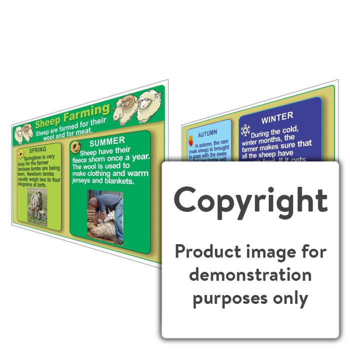 Full colour wall charts / posters depicting the process of sheep farming in the different seasons; spring, summer, autumn and winter. These charts also have a picture depicting each stage.