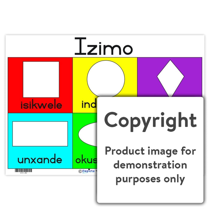 Full colour wall chart / poster depicting six different shapes with their name, in Zulu.