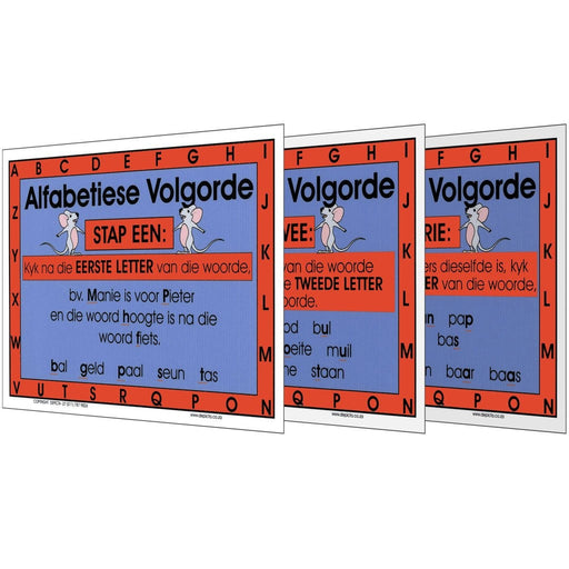 Wall Charts and PostersCode: A-AVOriginal price R 105.00 - Original price R 105.00Original priceR 105.00R 105.00 - R 105.00Current price R 105.00| /Full colour wall charts / posters depicting three steps to using alphabetical order, in Afrkiaans " Alfabetiese Volgorde ". Each chart explains the...