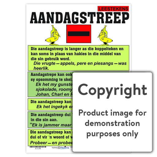 Wall Charts and PostersCode: A-LT6Original price R 35.00 - Original price R 35.00Original priceR 35.00R 35.00 - R 35.00Current price R 35.00| /Full colour wall chart / poster depicting a dash, in Afrikaans. This poster describes what a dash is and when it is used. This poster also gives ex...