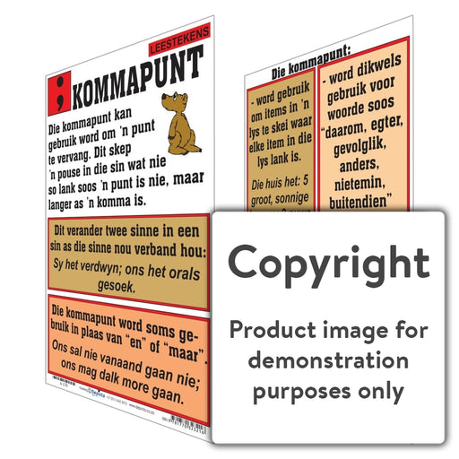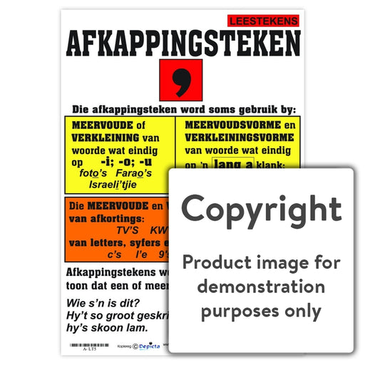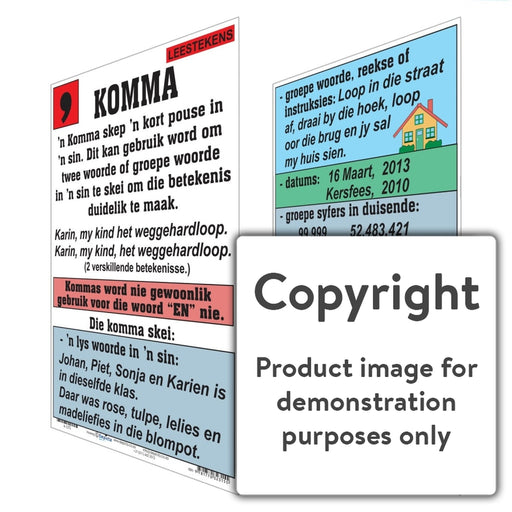 Wall Charts and PostersCode: A-LT2Original price R 70.00 - Original price R 70.00Original priceR 70.00R 70.00 - R 70.00Current price R 70.00| /Full colour wall chart / poster depicting a comma, in Afrikaans. This poster describes what a comma is and when it is used. This poster also gives ...