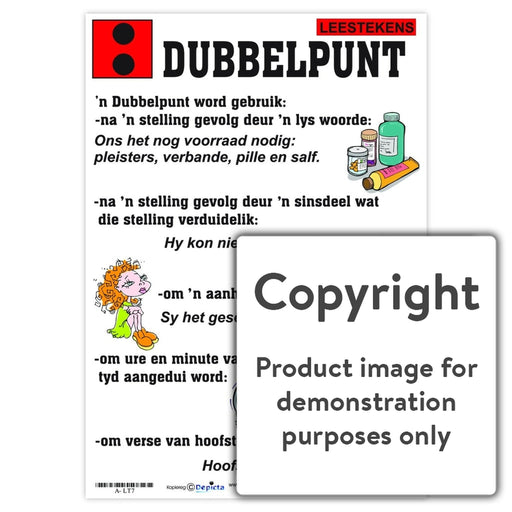 Wall Charts and PostersCode: A-LT7Original price R 35.00 - Original price R 35.00Original priceR 35.00R 35.00 - R 35.00Current price R 35.00| /Full colour wall chart / poster depicting a colon, in Afrikaans. This poster describes what a colon is and when it is used. This poster also gives ...