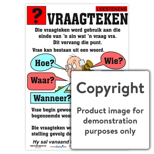 Wall Charts and PostersCode: A-LT3Original price R 35.00 - Original price R 35.00Original priceR 35.00R 35.00 - R 35.00Current price R 35.00| /Full colour wall chart / poster depicting a question mark, in Afrikaans " Vraagteken ". This poster describes what a question mark is and when it i...