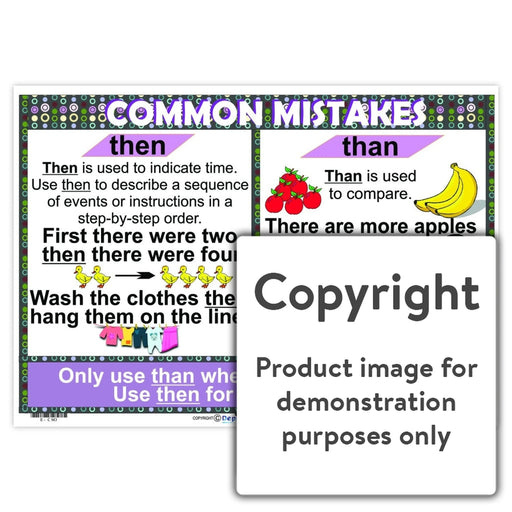 Wall Charts and PostersCode: E-CM3Original price R 35.00 - Original price R 35.00Original priceR 35.00R 35.00 - R 35.00Current price R 35.00| /Full colour wall chart / poster showing common mistakes with the words: then and than. This chart shows an explanation of each word and gives an e...