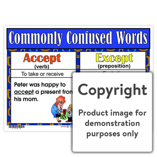Wall Charts and PostersCode: E-CCW-AEOriginal price R 35.00 - Original price R 35.00Original priceR 35.00R 35.00 - R 35.00Current price R 35.00| /Full colour wall chart / poster showing the difference between two commonly confused words: accept and except. This chart shows the definition of e...