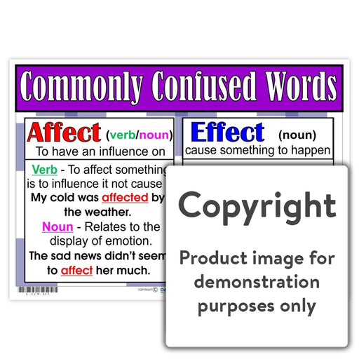 Wall Charts and PostersCode: E-CCW-AEFOriginal price R 35.00 - Original price R 35.00Original priceR 35.00R 35.00 - R 35.00Current price R 35.00| /Full colour wall chart / poster showing the difference between two commonly confused words: affect and effect. This chart shows the definition of e...