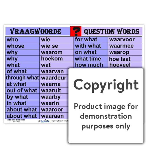 Wall Charts and PostersCode: AE-QVOriginal price R 35.00 - Original price R 35.00Original priceR 35.00R 35.00 - R 35.00Current price R 35.00| /Full colour wall chart/poster depicting 26 different Question Words " Vraagwoorde " in English and Afrikaans.