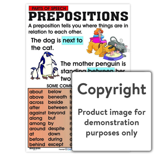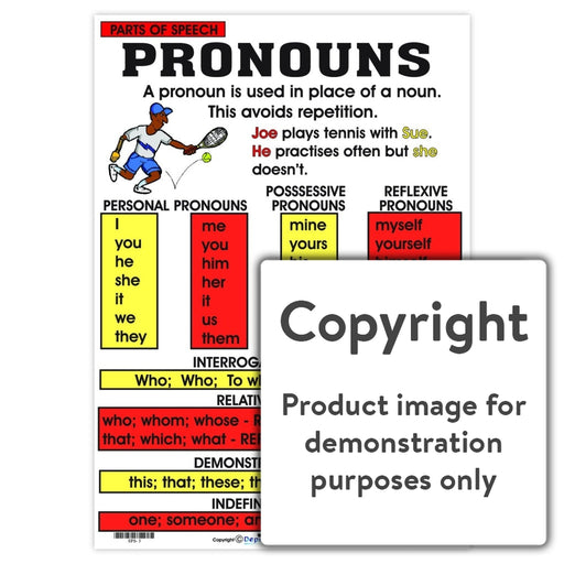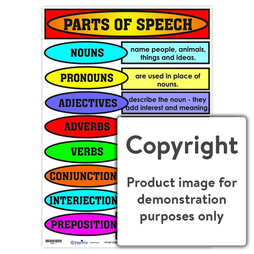 Full colour wall chart / poster depicting eight different Parts of Speech with an explanation of each. Nouns Pronouns Adjectives Adverbs Verbs Co...