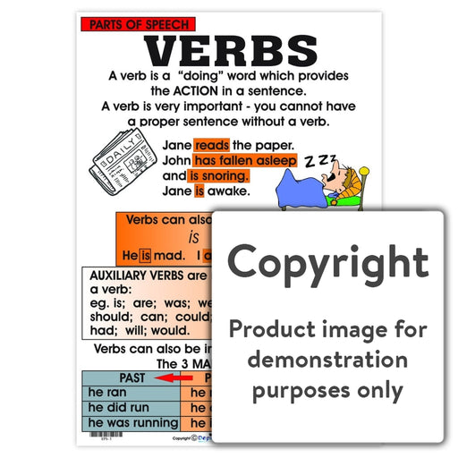 Full colour wall chart / poster explaining verbs. This chart gives a definition of a verb and gives examples. This poster also explains and gives e...