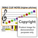 Full colour wall chart / poster depicting treble clef notes (higher pitches). This chart depicts the treble clef notes on a staff and on keys.