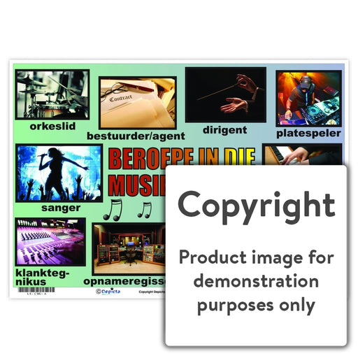Full colour Afrikaans wall chart / poster depicting 10 different types of careers in music "Beroepe in die Musiekbedryf ". Use this chart to por...
