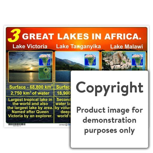 Wall Charts and PostersCode: SSG-GLA-EOriginal price R 35.00 - Original price R 35.00Original priceR 35.00R 35.00 - R 35.00Current price R 35.00| /Full colour wall chart / poster naming and depicting the 3 great lakes in Africa (Lake Victoria, Lake Tanganyika and Lake Malawi) with 3 facts abou...