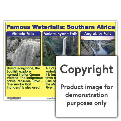 Wall Charts and PostersCode: SSG-FWF-EOriginal price R 35.00 - Original price R 35.00Original priceR 35.00R 35.00 - R 35.00Current price R 35.00| /Full colour wall chart / poster depicting and describing the most famous waterfalls in Southern Africa. These waterfalls are: Victoria Falls Male...