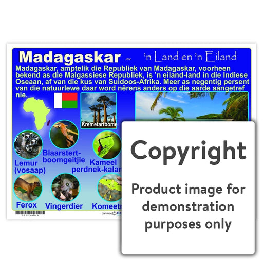Wall Charts and PostersCode: SSG-MAD-AOriginal price R 35.00 - Original price R 35.00Original priceR 35.00R 35.00 - R 35.00Current price R 35.00| /Full colour wall chart / poster with facts about Madagascar - A Country and an Island, in Afrikaans. This chart explains where Madagascar is situat...