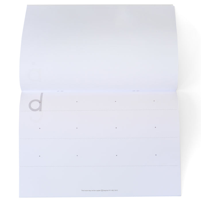 A CAPS compliant workbook that helps young learners perfect their small letter-writing. Each page has one letter of the alphabet written on it. The pupil traces the first letter starting at the dot, and then repeats that letter to complete the line and the rest of the page. Repetition helps pupils increase their writing skills and confidence. The book does not proceed alphabetically, but rather starts with the simplest letters for children to form, progressively helping them to master more and more complex shapes.