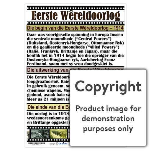 Full colour wall chart / poster depicting information about World War One, in Afrikaans " Eerste Wereldoorlog ". This chart explains the start and ...