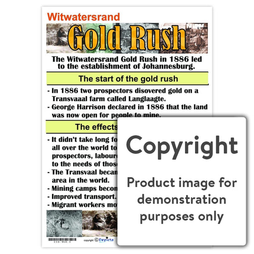 Full colour wall chart / poster depicting the Gold Rush in the Witwatersrand. This chart lists facts about the start of the Gold Rush as well as th...
