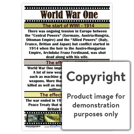 Full colour wall chart / poster depicting information about World War One. This chart explains the start and the effects of WW1.