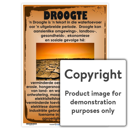 Wall Charts and PostersCode: ND-D-AOriginal price R 35.00 - Original price R 35.00Original priceR 35.00R 35.00 - R 35.00Current price R 35.00| /Full colour wall chart / poster defining droughts, in Afrikaans " Droogte " and depicting different environmental, agricultural, health, economic a...