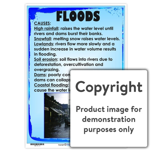Wall Charts and PostersCode: ND-FL-EOriginal price R 35.00 - Original price R 35.00Original priceR 35.00R 35.00 - R 35.00Current price R 35.00| /Full colour wall chart / poster depicting the causes of floods, such as: High rainfall Snowfall Lowlands Soil erosion Dams Coastal Flooding