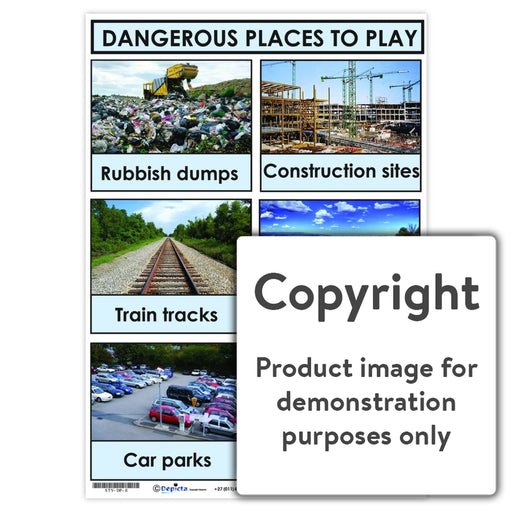 Wall Charts and PostersCode: STY-DP-EOriginal price R 35.00 - Original price R 35.00Original priceR 35.00R 35.00 - R 35.00Current price R 35.00| /Full colour wall chart / poster with 6 squares depicting dangerous places to play. Each square has a picture of a dangerous place to play with the...