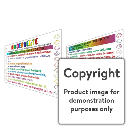 Wall Charts and PostersCode: LO2-AOriginal price R 70.00 - Original price R 70.00Original priceR 70.00R 70.00 - R 70.00Current price R 70.00| /Full colour wall charts / posters depicting children's rights, in Afrikaans. This chart lists 10 rights that children (under 18) have. This chart a...