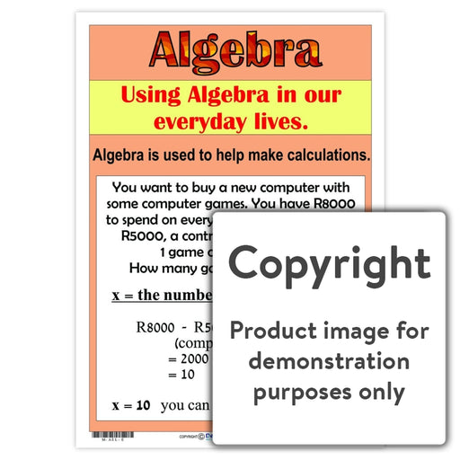 Wall Charts and PostersCode: M-AEL-EOriginal price R 35.00 - Original price R 35.00Original priceR 35.00R 35.00 - R 35.00Current price R 35.00| /Full colour wall chart / poster depicting Algebra. This chart gives an example of how to use Algebra to help make calculations.