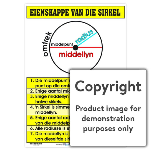 Wall Charts and PostersCode: M15-A3Original price R 35.00 - Original price R 35.00Original priceR 35.00R 35.00 - R 35.00Current price R 35.00| /Full colour wall chart / poster depicting the properties of a circle, in Afrikaans " Eienskappe van die Sirkel ". This chart shows 7 properties of...