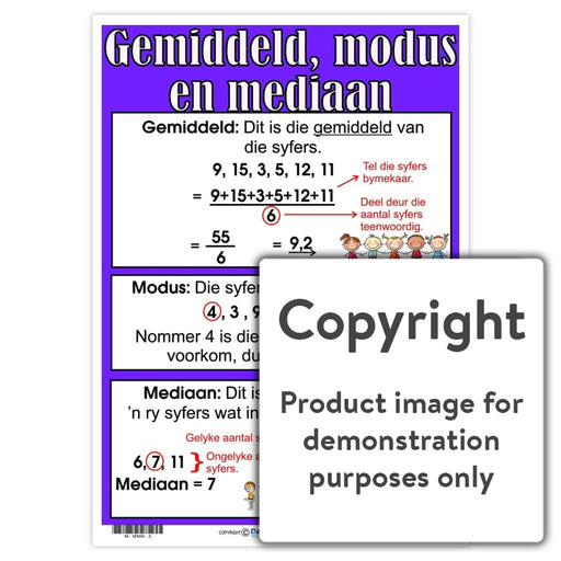 Wall Charts and PostersCode: M-MMM-AOriginal price R 35.00 - Original price R 35.00Original priceR 35.00R 35.00 - R 35.00Current price R 35.00| /Full colour wall chart / poster depicting the mean, mode and median, in Afrikaans " Gemiddeld, modus en mediaan ". This chart defines the different...