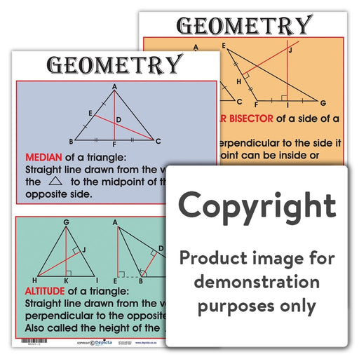 Wall Charts and PostersCode: MSG1-EOriginal price R 70.00 - Original price R 70.00Original priceR 70.00R 70.00 - R 70.00Current price R 70.00| /Full colour wall charts / posters depicting Geometry. These charts define the median, altitude, perpendicular bisector and the angles of a triangl...