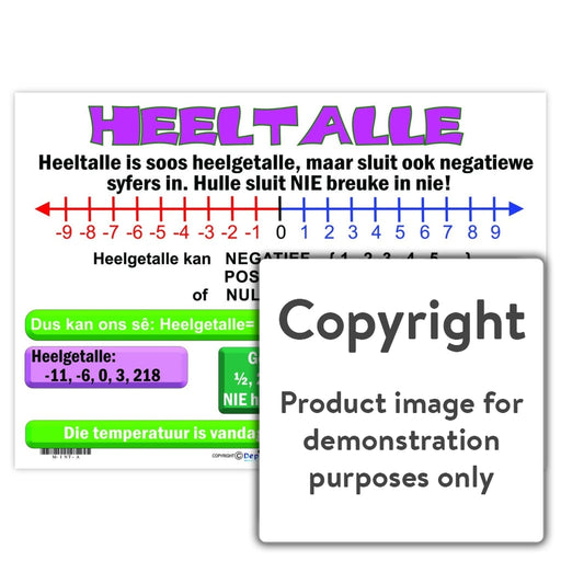 Wall Charts and PostersCode: M-INT-AOriginal price R 35.00 - Original price R 35.00Original priceR 35.00R 35.00 - R 35.00Current price R 35.00| /Full colour wall chart / poster depicting integers, in Afrikaans " Heeltalle ". This poster defines and gives examples of positive and negative int...