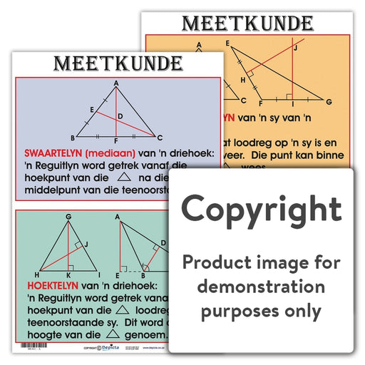 Wall Charts and PostersCode: MSG1-AOriginal price R 70.00 - Original price R 70.00Original priceR 70.00R 70.00 - R 70.00Current price R 70.00| /Full colour wall charts / posters depicting Geometry, in Afrikaans. These charts define the median, altitude, perpendicular bisector and the angles...