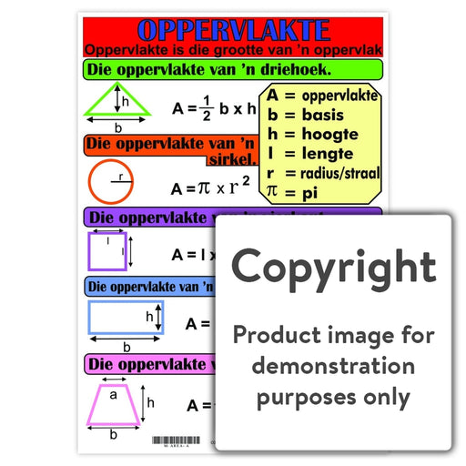 Wall Charts and PostersCode: M-AREA-AOriginal price R 35.00 - Original price R 35.00Original priceR 35.00R 35.00 - R 35.00Current price R 35.00| /Full colour wall chart / poster depicting Area, in Afrikaans. This chart depicts the area formula for a triangle, circle, square, rectangle, parall...
