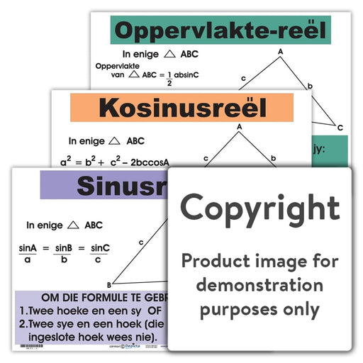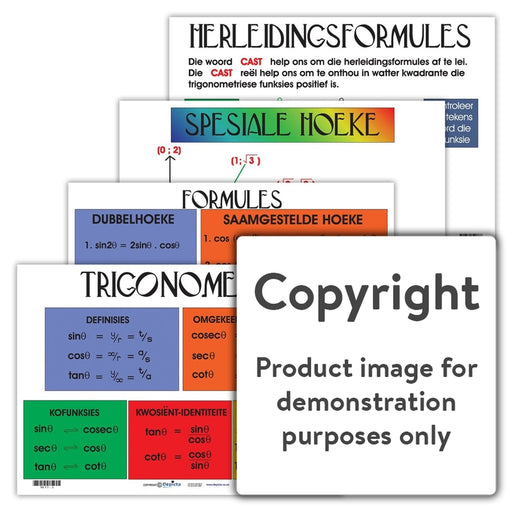Wall Charts and PostersCode: MST1-AOriginal price R 105.00 - Original price R 105.00Original priceR 105.00R 105.00 - R 105.00Current price R 105.00| /Full colour wall charts / posters depicting trigonometry, in Afrikaans " Trigonometrie ". These charts depict and explain sine " sinusreel ", cosin...