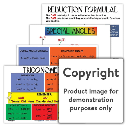 Wall Charts and PostersCode: MST3-EOriginal price R 140.00 - Original price R 140.00Original priceR 140.00R 140.00 - R 140.00Current price R 140.00| /Full colour wall charts / posters depicting different aspects of trigonometry. These charts depict: Definitions Reciprocals Co-functions Quotient...