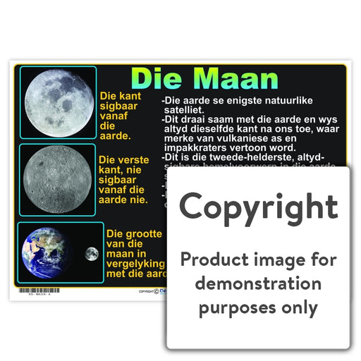 Wall Charts and PostersCode: NS-MAAN-AOriginal price R 35.00 - Original price R 35.00Original priceR 35.00R 35.00 - R 35.00Current price R 35.00| /Full colour wall chart / poster depicting the moon, in Afrikaans " Die Maan ". This chart gives five facts about the moon and four images depictin...