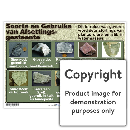 Wall Charts and PostersCode: SSG-SR-AOriginal price R 35.00 - Original price R 35.00Original priceR 35.00R 35.00 - R 35.00Current price R 35.00| /Full colour Afrikaans wall chart / poster defining sedimentary rocks. This chart depicts 10 different types of sedimentary rocks and their uses. "S...