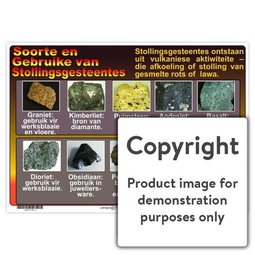 Wall Charts and PostersCode: SSG-IR-AOriginal price R 35.00 - Original price R 35.00Original priceR 35.00R 35.00 - R 35.00Current price R 35.00| /Full colour wall chart / poster depicting and naming 10 different types and uses of igneous rock, in Afrikaans " Soorte en Gebruike van Stollingsge...