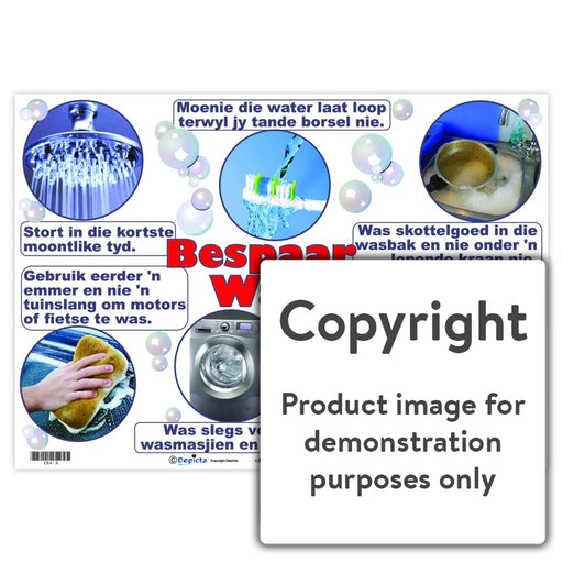 Wall Charts and PostersCode: C64-AOriginal price R 35.00 - Original price R 35.00Original priceR 35.00R 35.00 - R 35.00Current price R 35.00| /Full colour wall chart / poster depicting six different ways to save water, in Afrikaans " Bespaar water ". Don't let the tap run whilst brushing...
