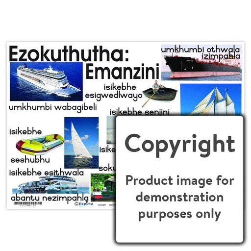 Wall Charts and PostersCode: C11TWA-ZUOriginal price R 35.00 - Original price R 35.00Original priceR 35.00R 35.00 - R 35.00Current price R 35.00| /Full colour wall chart / poster depicting eleven different forms of transport that is used on/in the water, in Zulu " Ezokuthutha - Emanzini ". Ea...