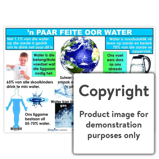 Wall Charts and PostersCode: C65-AOriginal price R 35.00 - Original price R 35.00Original priceR 35.00R 35.00 - R 35.00Current price R 35.00| /Full colour wall chart / poster depicting ten different facts about water with pictures, in Afrikaans " 'n Paar Feite oor Water ". " Net 1.1% va...