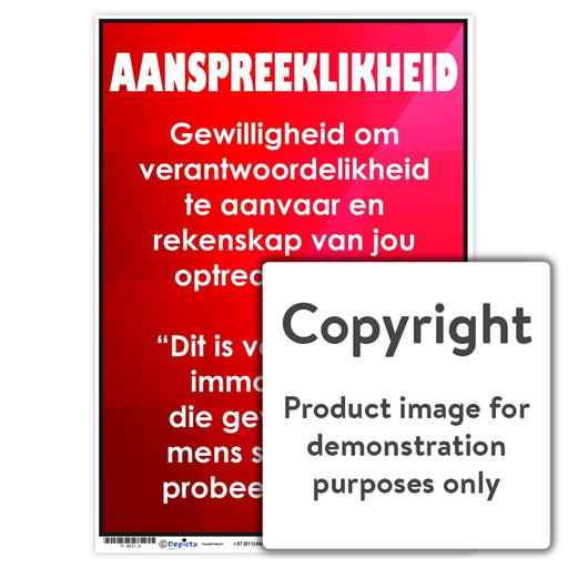 Wall Charts and PostersCode: V-ACC-AOriginal price R 35.00 - Original price R 35.00Original priceR 35.00R 35.00 - R 35.00Current price R 35.00| /Full colour Afrikaans wall chart / poster depicting the value Accountability "Aanspreeklikheid". This chart defines the word and quotes Mahatma Gan...
