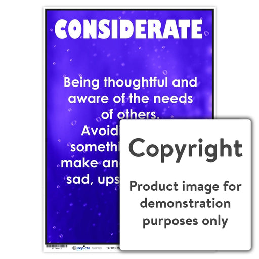 Wall Charts and PostersCode: V-CON-EOriginal price R 35.00 - Original price R 35.00Original priceR 35.00R 35.00 - R 35.00Current price R 35.00| /Full colour wall chart / poster depicting and defining the value - considerate.
