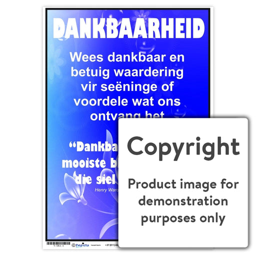 Wall Charts and PostersCode: V-GRA-AOriginal price R 35.00 - Original price R 35.00Original priceR 35.00R 35.00 - R 35.00Current price R 35.00| /Full colour Afrikaans wall chart / poster defining the value - Gratitude "Dankbaarheid " with a quote by Henry Ward Beecher about being grateful.