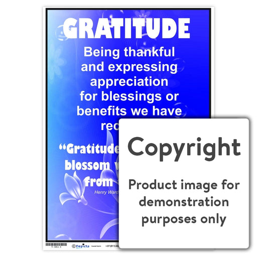 Wall Charts and PostersCode: V-GRA-EOriginal price R 35.00 - Original price R 35.00Original priceR 35.00R 35.00 - R 35.00Current price R 35.00| /Full colour wall chart / poster depicting and defining the value - Gratitude with a quote by Henry Ward Beecher about being grateful.