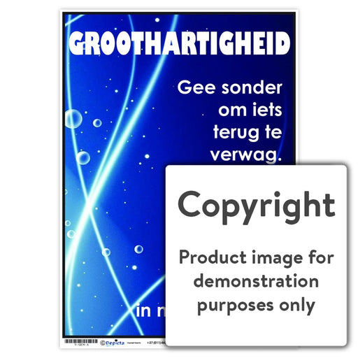 Wall Charts and PostersCode: V-GEN-AOriginal price R 35.00 - Original price R 35.00Original priceR 35.00R 35.00 - R 35.00Current price R 35.00| /Full colour wall chart / poster depicting and defining the word generosity, in Afrikaans " Groothartigheid " and being generous.