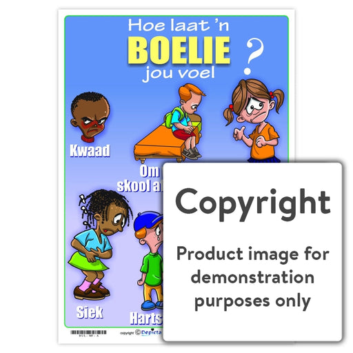 Wall Charts and PostersCode: BUL-MF-HG-AOriginal price R 35.00 - Original price R 35.00Original priceR 35.00R 35.00 - R 35.00Current price R 35.00| /Full colour wall chart / poster depicting how bullies can make you feel, in Afrikaans " Hoe laat 'n boelie jou voel ?" with full colour pictures d...